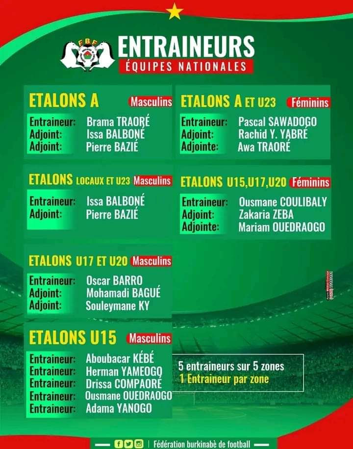 La Fédération Burkinabè de Football (FBF) a récemment annoncé les entraîneurs désignés pour encadrer ses différentes équipes nationales. Cette initiative témoigne de l'engagement renouvelé envers le développement du football burkinabè à tous les niveaux, qu'il s'agisse des équipes de jeunes ou des équipes féminines.